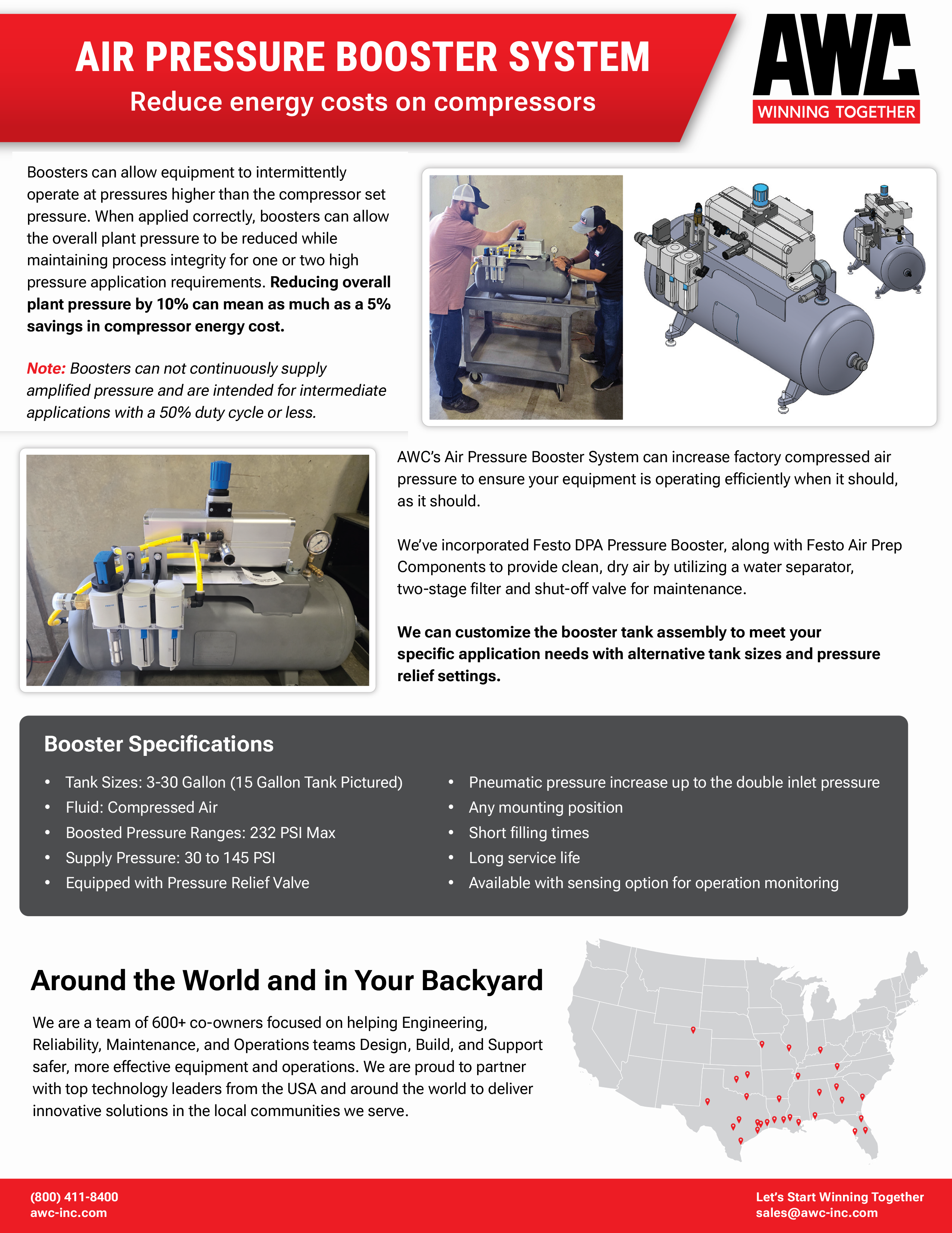 At times when there is not enough plant air pressure available for a specific machine operation or process, AWC's Air Pressure Booster System can momentarily provide a higher operational pressure. This helps operate equipment located at the end of the pneumatic supply source, or in a situation where every other pneumatic process on a machine can operate at 85 psi but one needs to operate intermittently at 120psi.